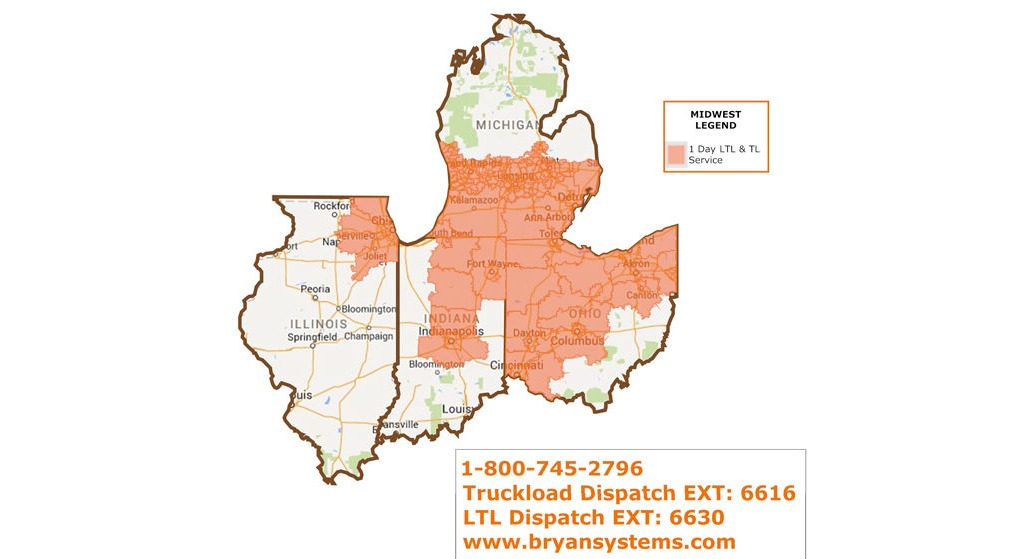 Standard transit time for LTL movements to and from a majority of IL, IN, MI, and OH in one business day.